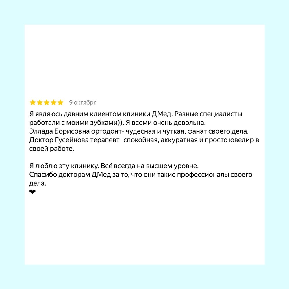 💬«Огромная благодарность врачу-ортодонту Грищенко Э. Б. и врачу-терапевту Гусейновой А. за профессионализм, внимание и заботу.»